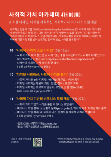 ◇ [6월 13일 목] 사회적 가치 아카데미 4th Round=사회혁신 전문가 그룹 CGSI(Consultative Group for Social Impact)의 사회적 가치 아카데미 4번째 라운드가 오는 6월 13∼27일까지 매주 목요일에 강동구 소셜타운 B1에서 개최된다. 이번 아카데미 네번째 라운드에서는 ‘소셜 디자인, 디지털 사회혁신 그리고 사회적 가치 비즈니스 모델 개발’을 주제로 이론과 담론을 넘어 실질적인 전략과 방법, 사례를 공유할 예정이다.