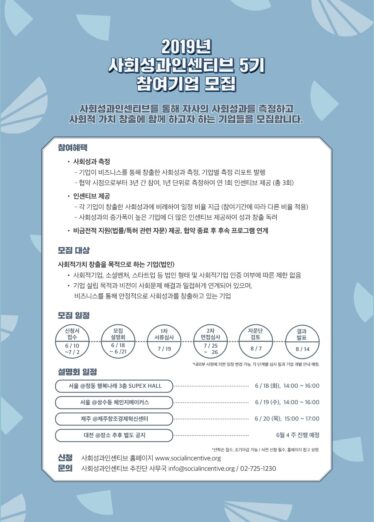 ◇ [6월 18일 화] 2019 사회성과인센티브 5기 모집 설명회=사회성과인센티브 사무국이 2019 사회성과인센티브 5기 모집과 관련 지역별 사업 설명회를 6월 18일부터 지역별로 개최된다. 사회성과인센티브(SPC, Social Progess Credit) 제도는 사회적기업이 창출한 사회성과를 화폐 단위로 측정해 금전적으로 보상해 주는 제도다. 사업은 사회적가치 창출을 목적으로 하는 기업을 대상으로 사회성과 측정과 인센티브 제공, 비금전적 법률, 특허 관련 자문, 협약 종료 후 후속 프로그램 연계까지 지원해준다. 지역별 일정은 6월 18일 서울 정동 행복나래 3층 SUPEX HALL, 19일 서울 성수동 체인지메이커스, 20일 제주창조경제혁신센터, 6월 4주 대전에서 진행될 예정. 행사에 대한 자세한 내용은 이곳에서 확인할 수 있다.