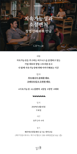 ◇ [6월 05일 수] 지속가능성과 소셜벤처: 창업 선배와의 만남=제주국제자유도시개발센터(JDC)가 제주지역 사회적 경제 활성화를 위해 소셜벤처 창업 선배와의 만남을 도모하는 2번째 소셜벤처 강연을 6월 5일 14시부터 제주혁신성장센터 냥그늘 세미나실에서 진행한다. 이번 행사에서는 지속가능성을 추구하는 비즈니스를 운영하고 있는 기업 대표의 창업 스토리를 듣고 다 함께 지속가능성에 대해 이야기해보는 시간을 가질 예정이다. 연사는 ㅿ시민이 주인이 되는 재생에너지의 미래를 위한 비즈니스를 운영하는 루트에너지의 윤태환 대표와 수공예품을 통해 사람과 세상을 연결하고 사회에 필요한 변화를 만드는 크래프트링크의 고귀현 대표가 본인들의 창업 스토리를 공유하고 지속가능한 미래에 대한 이야기를 나눌 예정이다. 관심 있는 제주도민이면 누구나 참여 가능하며 행사에 대한 자세한 내용은 이곳에서 확인할 수 있다.