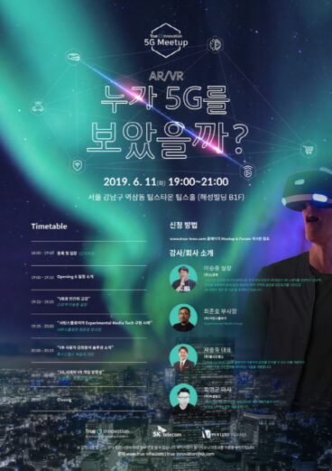 이번 밋업의 주제는 ‘AR, VR 누가 5G를 보았을까?’ SKT의 5G 스타트업 육성 프로그램인 트루이노베이션 5GX 액셀러레이터 시작에 맞춰 진행하는 것이다. VR 게임 개발사인 스코넥스 이승종 실장, 픽셀핌스 최명균 이사, 서튼스플로어 김준호 부사장이 강연자로 나서 인사이트를 공유한다.