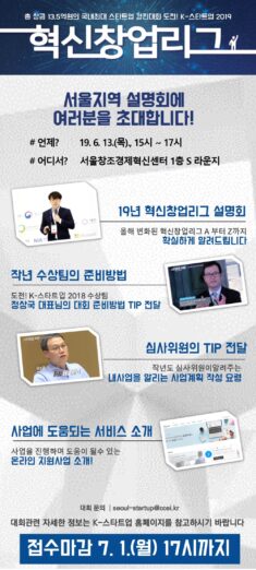 도전 K-스타트업 2019는 5월 24일 공고 후, 5.27(월)부터 7월 12(금)까지 리그별로 신청‧접수(리그별 기간 상이)를 받을 예정이며, 7~8월 예선을 통해 152팀의 본선 진출팀을 선발한다. 이어 9~10월 본선, 11월 왕중왕전을 거쳐 최종 수상팀을 결정할 계획이며, 왕중왕전은 오는 11월 개최되는 글로벌 스타트업 페스티벌 ‘Come UP 2019’에서 진행될 예정이다. 대회에 관련된 자세한 정보는 K-스타트업 홈페이지에서, 서울지역 설명회는 이곳에서 할 수 있다.