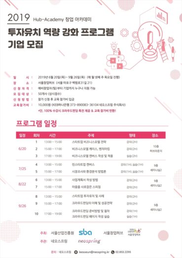 ◇[6월 20일 목] 투자 유치 역량 강화 아카데미 = 크라우드펀딩 플랫폼 네오스프링에서 투자 유치 역량 강화 아카데미를 오는 6월 20일부터 9월 26일 목요일까지 4달간 서울창업허브에서 개최한다. 이번 아카데미는 창업단계 또는 창업성장단계의 기업이 안정적 제품개발을 위한 자금이나 사업 확장을 위한 자금 조달을 위한 커리큘럼으로 구성되어 있다고 한다. 프로그램은 스타트업 비즈니스모델 전략, 린스타트업 캔버스, 시장조사와 환경분석 방법론, 사업계획서 작성 방법, 스타트업 투자유치 및 사례, 크라우드 펀딩의 이해 및 성공전략 등 강의와 실습을 병행하여 진행될 예정이다. 투자 유치 역량 강화 아카데미는 예비창업자(팀)부터 기업까지 누구나 신청 가능하며 이곳에서 신청할 수 있다.