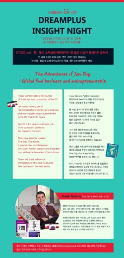 ◇[6월 21일 금] 드림플러스 스타트업 인사이트 나잇 6월: Super Jam CEO Fraser doherty = 한화생명 드림플러스가 월 1회 비즈니스 업계를 선도한 스타트업 대표의 이야기를 듣는 인사이트 토크쇼 ‘드림플러스 인사이트 나잇’을 오는 6월 21일 금요일 서울 드림플러스 강남에서 개최한다. 이번 6월 토크쇼는 ‘잼’으로 스무살에 백만장자가 된 슈퍼잼 CEO Fraser doherty의 특강으로 진행될 예정이다. 슈퍼잼과 Beer5를 창업했던 경험을 바탕으로 글로벌 푸드 비즈니스 산업에 있어서의 조언과 창업자에게 필요한 기업가 정신에 대해 이야기할 예정이다. 한편 슈퍼잼은 전 세계 2,000 여개 매장을 가지고 있으며 연간 100만 병씩 판매된다. 이번 행사에서는 순차통역을 제공하며 행사에 대한 자세한 내용과 참가신청은 이곳에서 할 수 있다.