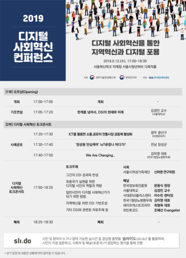 ◇[6월 12일 수] 2019 디지털 사회혁신 컨퍼런스 = 과학기술정보통신부가 제32회 정보문화의 달을 맞아 주간 행사로 디지털 사회혁신 컨퍼런스를 오는 6월 12일 수요일 서울혁신파크 미래청 서울시청년허브에서 개최한다. 이번 디지털 사회혁신 컨퍼런스는 ‘디지털 사회혁신을 통한 지역혁신과 디지털 포용’을 주제로 디지털 혁신의 주체로서 시민 역할을 조명하기 위함. 행사는 김경민 서울대학교 교수의 기조연설을 시작으로 광주 광산구 ㈜엔유비즈의 ’ICT를 활용한 소통, 공유의 전통시장 공동체 활성화’, 전남 장성군의 ‘장성형 안심케어 IoT@엄니 어디가?’, 김미영 한국1형강뇨병환우회 대표가 ‘We Are Changing..’ 의 사례공유를 할 예정이다. 또한 ‘그간의 DSI 성과와 반성’, ‘포용국가 실현을 위한 디지털 시민의 역할과 역량’, ‘일반시민이 디지털 사회혁신가가 되기 위한 방법’, ‘지역혁신을 위한 DSI 기반조성’ 등 기타 DSI와 관련된 자유주제를 가지고 한국정보화진흥원 문용식 원장, 서울대학교 김경민 교수, 서대문50플러스센터 이수빈 센터장 등 패널이 참석하는 디지털 사회혁신 토크콘서트도 함께 진행할 예정이다. 행사에 대한 자세한 내용과 참가신청 이곳에서 할 수 있다.