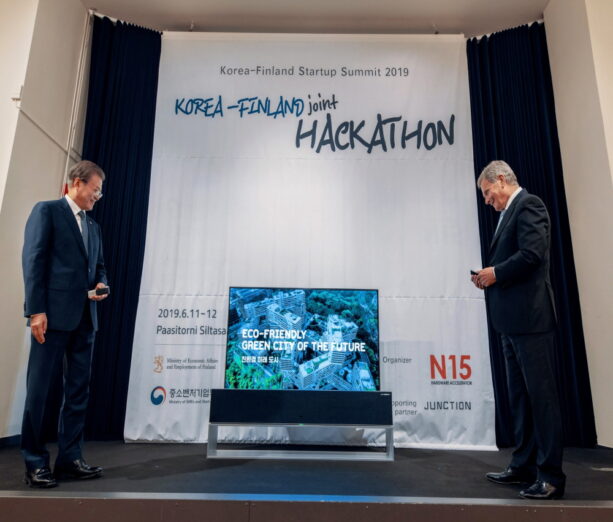 LG전자는 헬싱키 콩그레스 빠씨또르니 1층 해커톤 무대에 65인치 롤러블TV를 설치했다. 문재인 대통령과 사울리 대통령은 해커톤에 참가한 대학생을 격려한 뒤 해커톤 주제를 발표했다.