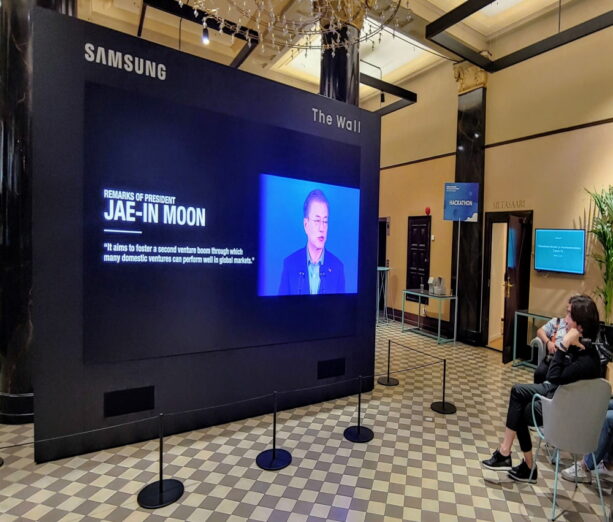 삼성전자는 행사장인 헬싱키 콩그레스 빠시또르니 현관에 146인치 모듈러 TV를 설치했다. 제품 이름은 더 월(The Wall). 대형 스크린에는 문재인 대통령의 혁신 메시지와 한국 스타트업 생태계 현황, 한-핀 스타트업 서밋 소개와 K-pop 영상이 흘러나왔다. 행사 당일 문재인 대통령과 사울리 니니스퇴 핀란드 대통령은 대형 TV 앞에서 악수하며 기념사진을 찍었다. 현장에 도착한 참관객도 대형 스크린을 배경으로 인증샷을 남겼다.