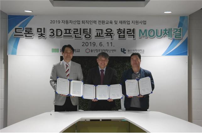 울산창조경제혁신센터가 울산과학대학교 무인항공기술원, 울산대학교 재난안전센터와 6월 11일 자동차 산업 퇴직인력 전환 교육 및 재취업 지원 사업에 관한 협약을 체결했다고 밝혔다.