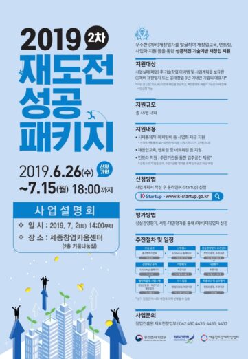 세종창조경제혁신센터가 7월 15일까지 2019 재도전 성공패키지 지원사업 2차 재창업자를 모집한다.