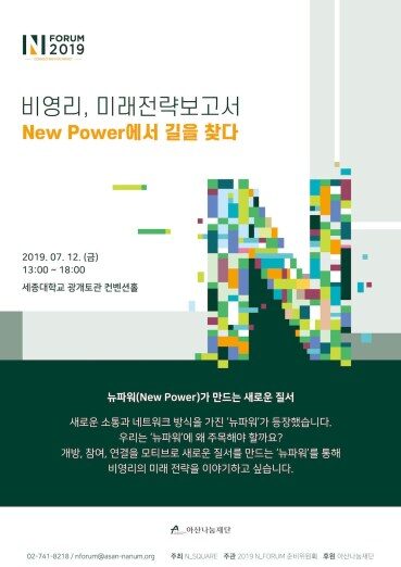 ◇[7월 12일 금요일] 아산나눔재단, 2019 ‘엔 포럼(N_FORUM)’=아산나눔재단이 오는 7월 12일 세종대학교 광개토관 컨벤션홀에서 ‘2019 엔 포럼(N_FORUM)’을 개최한다. 엔 포럼은 아산나눔재단의 비영리 전문 교육 프로그램 ‘아산 프론티어 아카데미’ 출신 동문이 자발적으로 기획한 행사로, 다양한 분야의 융합을 통해 국내 비영리 분야의 발전 방향을 모색하기 위해 2015년부터 시작돼 올해 5회차를 맞았다. 이번 포럼은 ‘비영리 미래전략보고서: 뉴파워에서 길을 찾다’라는 주제로 진행되며, 초연결사회에 접어들며 새로운 소통과 네트워크 방식을 가진 ‘뉴파워’가 등장함으로써 이를 이해하고, 이들이 사회를 변화시키는 현상을 살펴볼 예정이다.