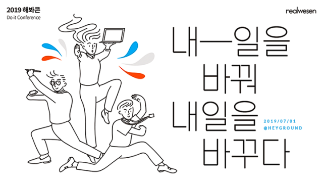◇[7월 01일 수요일] = 2019 해봐콘 : 내 일을 바꿔 내일을 바꾸다 = 스스로의 브랜드를 만들어 나가고자 하는 주체적인 사람들을 위한 컨퍼런스 ‘해봐콘’이 오는 7월 1일 월요일 오후 7시 30분부터 헤이그라운드 지하 1층 체인지메이커스에서 개최된다. 이번 컨퍼런스는 ‘내 일을 바꿔 내일을 바꾸다’를 주제로 동명의 책의 저자 코누마 다이치의 스피치와 컨퍼런스를 주최하는 리얼비즌과 함께 일하는 방식이 변화하는 시대에 어떻게 현재와 미래의 커리어를 만들어나갈지레 대한 이야기를 나눌 예정이다.