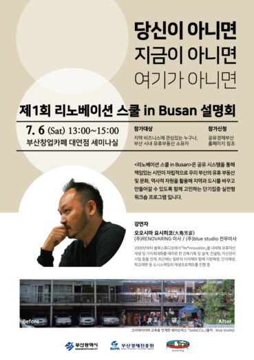 ◇[7월 06일 토요일] = 제 1회 in Busan 설명회 = 부산광역시와 부산경제진흥원에서 부산 지역 비즈니스의 활성화를 위한 리노베이션(Re*innovation) 스쿨 in Busan 설명회를 오는 7월 6일 토요일 오후 1시부터 부산창업카페 대연점 세미나실에서 개최한다. 이번 리노베이션 스쿨 in Busan은 공유 시스템을 통해 책임있는 시민이 자립적으로 부산과 유휴 부동산 및 문화, 역사적 자원을 활용해 지역과 도시를 바꾸고 만들어갈 수 있도록 함께 고민하는 단기집중 실전형 워크숍 프로그램이다. 행사에 참여하는 강연자는 2000년부터 블루스튜디오에서 Re*innovation을 내세워 유휴자산재생 및 가치최대화를 테마로 한 전축기획 및 설게, 컨설팅, 자산관리 사업 등을 전개하였고 최근에는 일본의 지자체와 함께 지방재생, 단지재생, 학교재편 등 도시스케일의 재생프로젝트를 진행중이다. 행사에 대한 자세한 내용과 참가신청은 이곳에서 할 수 있다.
