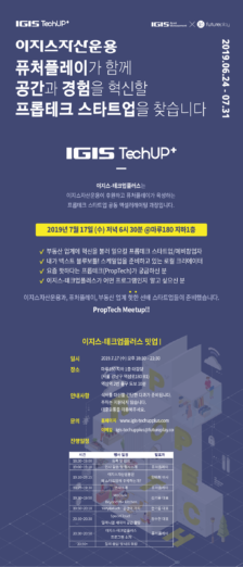 ◇[7월 17일 수요일] 이지스–테크업플러스 프로그램 설명회 & 프롭테크 밋업=퓨처플레이가 이지스자산운용 오는 7월 17일 오후 6시 30분부터 마루180 지하 1층 대강당에서 ‘이지스-테크업플러스 밋업’를 개최한다. 이번 행사에서는 이지스자산운용과 퓨처플레이가 공동으로 엑셀러레이팅 하는 이지스 테크업플러스 프로그램 설명회와 프롭테크 스타트업들이 자유롭게 네트워킹 할 수 있는 밋업까지 진행될 예정이다. 공유 주방 WeCook과 공간공유 O2O 서비스 스페이스클라우드가 발표에 참여하며, 이지스-테크업플러스 프로그램 설명회를 진행할 예정이다.