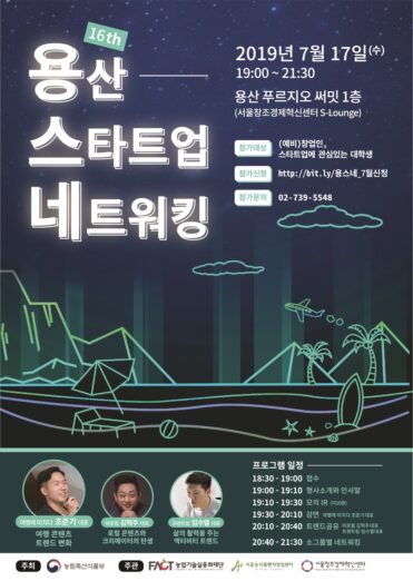 ◇[7월 17일 수요일] 용스네–용산 스타트업 네트워킹=서울창조경제혁신센터가 농림축산식품부, 농업기술실용화재단, 서울A+센터와 함께 제 16회 용산 스타트업 네트워킹(용스네)를 오는 17일 용산 푸르지오 써밋 1층 서울창조경제혁신센터에서 개최한다. 용쓰네는 다양한 분야 스타트업과 관계자간 소통을 위한 네트워킹 행사로 스타트업 관련 이슈와 정보, 트렌드를 나눌 수 있는 모의 IR, 강연, 트렌드 공유 기회를 마련하고 있다. 이번 용스네에서는 ‘여행 콘텐츠 트렌드 변화’을 주제로 진행될 예정이다. 발표에는 ‘여행 콘텐츠 트렌드 변화’에 대한 이야기를 여행에 미치다 조준기 대표가 ‘로컬 콘텐츠와 크리에이터의 탄생’을 비로컬 김혁주 대표가, ‘삶의 활력을 주는 액티비티 트렌드’를 프렌트립 임수열 대표가 이야기할 예정이다. 행사가 이후에는 발표 연사와 함께 소규모 네트워킹 자리도 준비돼 있다. 행사에 대한 자세한 내용과 참가신청은 이곳에서 할 수 있다.
