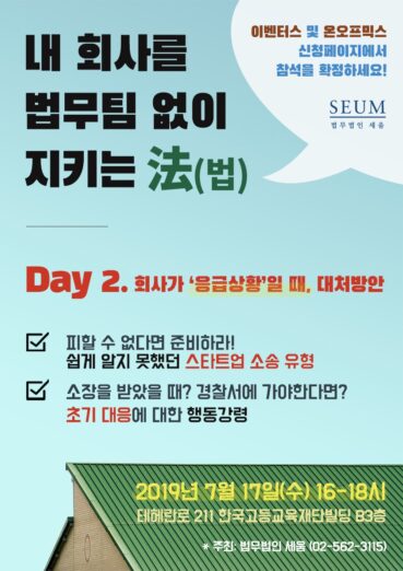 ◇[7월 17일 수요일] [법률 세미나] 내 회사를 법무팀 없이 지키는 법=법무법인 세움에서 오는 7월 17일 오후 4시부터 한국고등교육재단빌딩 지하3층 세미나실에서 ‘내 회사를 법무팀 없이 지키는 법’을 주제로 세미나를 개최한다. 이번 세미나는 법무팀이나 사내변호사가 없어도 소송이나 경찰 출석 요구 상황에 대처할 수 있는 포인트를 전하고자 마련됐으며 ‘회사가 응급상황일 때의 대처방안’에 대해 스타트업 소송 유형과 초기 대응 행동강령을 주제로 한다. 발표는 이현섭 변호사가 다양한 이슈를 바탕으로 발생되는 소송의 사례들을 짚어보고 어떻게 대비할 지, 이병일 변호사가 소송의 초기대응 방안을 이야기할 예정이다. 행사에 대한 자세한 내용과 참가신청은 이곳에서 할 수 있다.