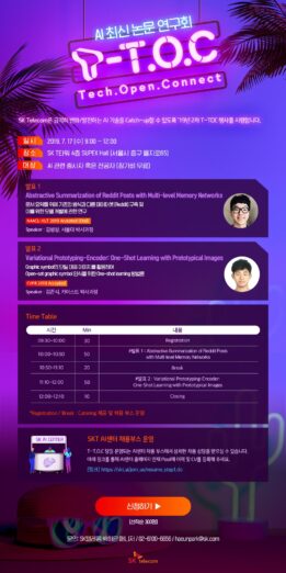 ◇[7월 17일 수요일] 제 8회 AI 최신 논문 연구회 T-T.O.C=SK텔레콤이 최신 인공지능 기술을 공유하고 토론하는 AI 최신 논문 연구회 ‘제 8회T-T.O.C(Tech. Open. Connect)’를 오는 7월 17일 9시 30분부터 서울 을지로 SK텔레콤 T타워에서 개최한다.