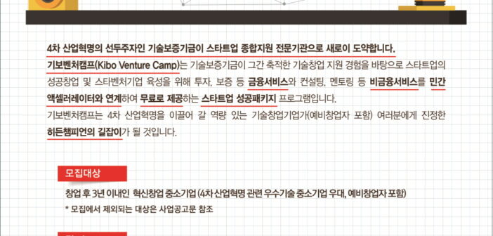 기술보증기금이 8월 7일까지 제5기 기보벤처캠프 참여기업을 모집한다고 밝혔다. 기보벤처캠프는 민간 액셀러레이터 등과 손잡고 기술창업기업을 스타벤처로 집중 육성하는 프로그램. 선정 기업에는 맞춤형 컨설팅과 분야별 멘토링, 민간 VC 네트워킹 등 모든 프로그램을 전액 무료로 지원한다. 수료 기업에는 투자와 보증 등 금융 서비스 외에 벤처인증, R&D 지원 등 비금융 서비스를 패키지로 제공한다. 모집 대상은 창업 3년 이내 혁신창업기업이나 예비창업자이며 평가를 거쳐 50개 안팎 기업을 9월 중 확정할 예정. 기보 측은 “캠프 참여기업이 체감할 수 있는 금융 서비스 제공을 위해 15억원까지 보증 지원하는 우대 프로그램을 신설했다”고 밝혔다. 자세한 내용은 기보 홈페이지를 통해 확인할 수 있다.
