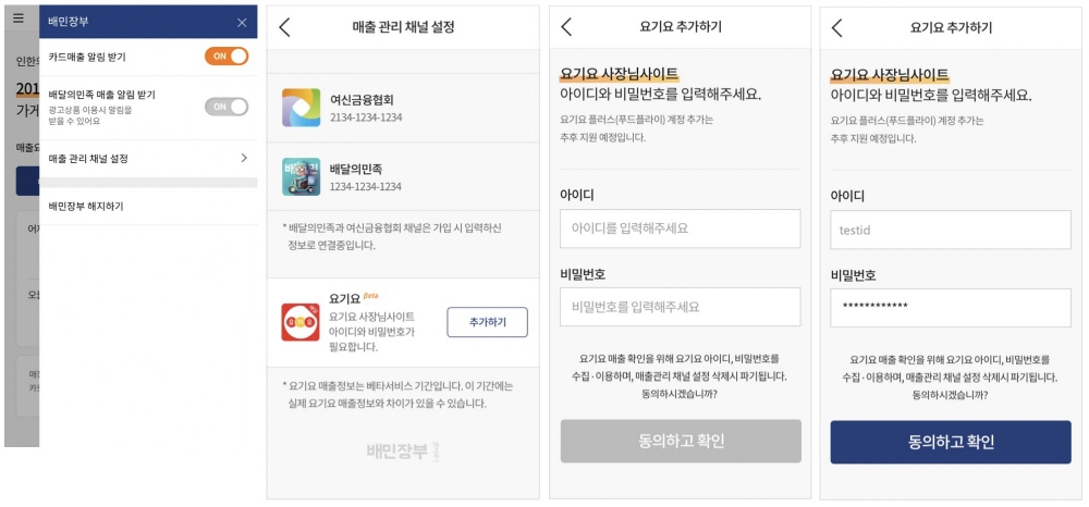 배달의민족을 운영하는 우아한형제들 측에 따르면 새로운 기능은 기존 오프라인 카드 결제와 주요 배달앱 매출 정보를 한 곳에서 관리하고 싶다는 음식점 업주 요청으로 시행됐다. 지난주부터는 연계 대상 배달앱도 확대해 나가고 있다. 최근 배민장부 이용 업주 대상 개인정보처리방침 변경을 고지한 것도 이 때문이라는 설명이다. 배민장부에서 타 배달앱 업주 전용 사이트 아이디와 비밀번호를 입력하면 배달의민족뿐 아니라 이용 중인 다른 배달앱 매출 정보를 확인할 수 있도록 구성했다.