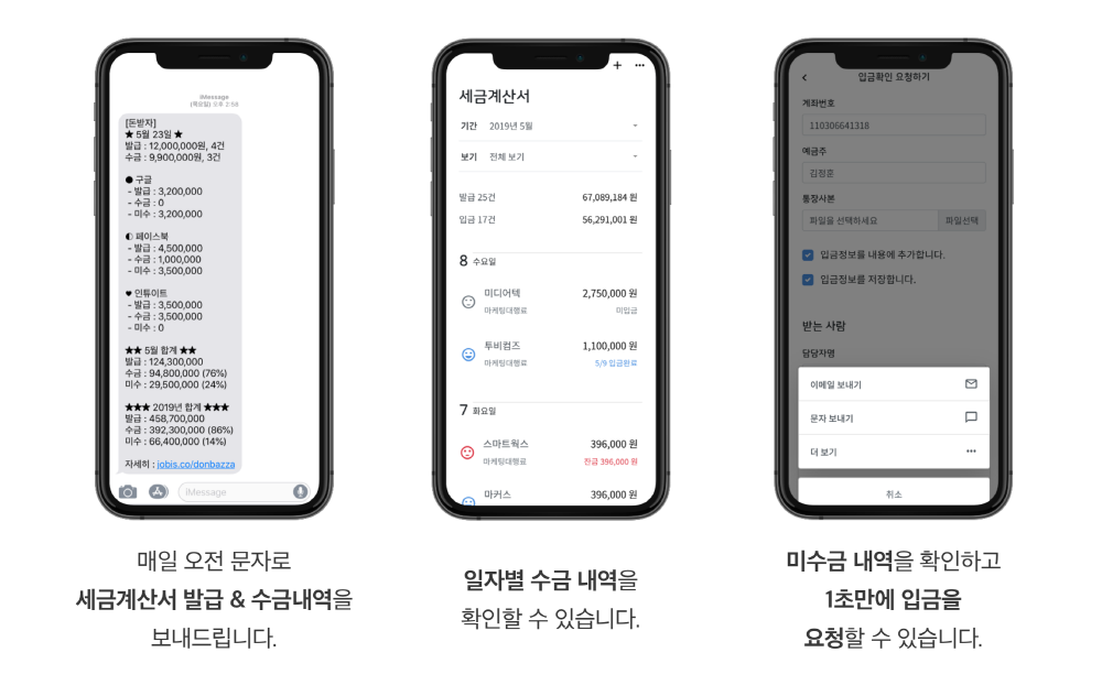 돈.받.자는 미수금 관리 업무를 줄여주는 서비스로 세금계산서 발행 후 계좌에 입금된 내역을 인공지능이 자동으로 확인, 정리해준다. 매일 수금 현황은 문자 메시지로 알려주며 원클릭 입금 요청을 통해 미입금 거래처에 입금을 요청할 수 있다. 해당 서비스는 무료로 이용할 수 있다.