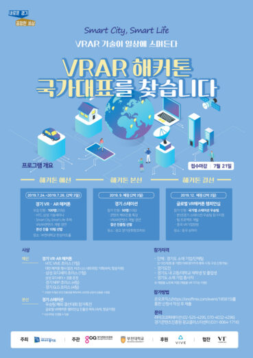2019 경기 VR·AR 해커톤은 4차 산업의 핵심 기술인 VR·AR을 활용한 도시 경쟁력 강화방안을 모색하고 시민의 행복한 삶 실현을 목표로 하는 콘텐츠 개발 경진대회다. 올해 해커톤 주제는 ‘스마트시티, 스마트라이프’다.