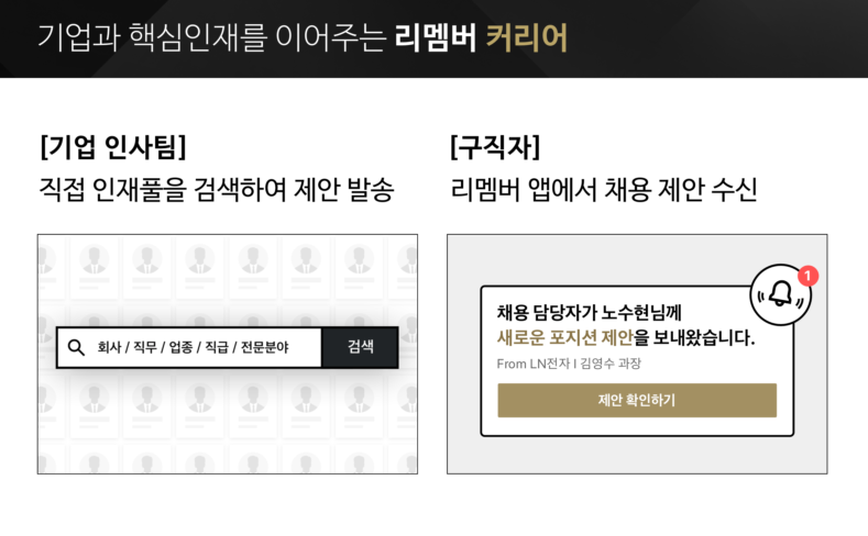 기업 인사팀은 리멤버 커리어 웹사이트에서 회사, 직무, 업종, 직급 등 다양한 기준으로 인재를 찾을 수 있다. 채용을 하고 싶은 인재에게는 리멤버 커리어 사이트에서 메시지를 보낼 수 있고 잠재적 구직자는 이 메시지를 리멤버 앱에서 받아볼 수 있다. 구직자는 리멤버 커리어에 프로필을 등록해 놓으면 기업 인사팀이 먼저 연락을 하기 때문에 굳이 구직 활동을 하지 않아도 좋은 기회들을 받아볼 수 있다.