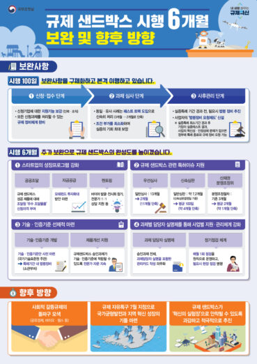 발표에 따르면 샌드박스 시행 6개월만에 과제 승인 연간목표 100건 중 81건이 승인됐으며 이 중 80%가 중소기업에 해당했다. 과제 접수부터 심사까지 평균 소요된 기간은 44일로 이는 영국, 일본을 비롯한 외국 평균 180일보다 빨랐으며 과기부와 산업부가 각각 4회, 금융위원회가 6회 규제특례심의원회를 개최했다.