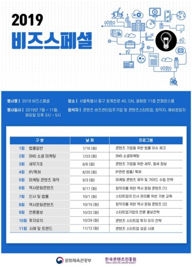 한국콘텐츠진흥원이 콘텐츠 스타트업과 창작자를 대상으로 광화문 CKL기업지원세너에서 비즈니스 실무 정보 오픈 특강 ‘비즈스페셜’을 개최한다고 밝혔다.