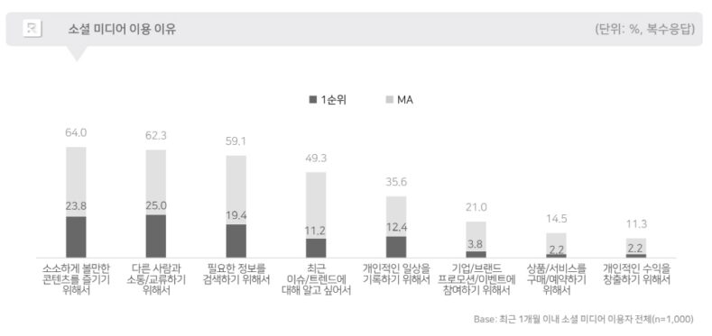 소셜미디어를 이용하는 이유로는 64%가 소소하게 볼만한 콘텐츠를 즐기기 위해서, 62.3%는 다른 사람과 소통화고 교류하기 위해서라고 답했다. 이어 필요한 정보를 찾기 위해 59.1%, 최근 이슈 트렌드를 알고 싶어서 49.3% 순을 나타냈다. 소셜미디어가 커뮤니케이션 채널에서 콘텐츠 소비 채널로 변하고 있는 것.