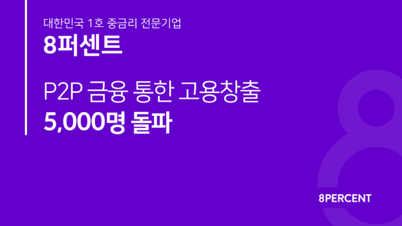 8퍼센트가 P2P금융 서비스 확장으로 인한 고용창출이 5,000명을 돌파했다고 밝혔다. 설립 이후 P2P 대출로 자금을 공급받은 중소벤처기업 816곳과 소상공인이 신규 인력 5,158명을 채용했다는 것. 이들 법인은 647억원을 공급받아 이 중 570억원을 상환했고 26일 현재 77억원을 상환 중이다.