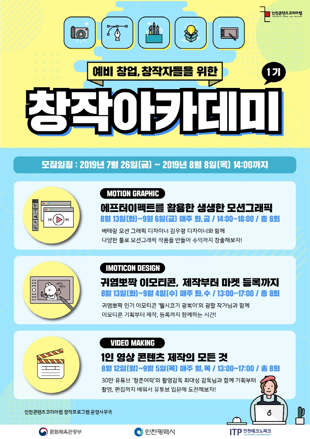 창작아카데미는 문화 콘텐츠 분야 전문가를 양성하고 창업과 창작을 창출하기 위한 프로그램. 분야별 창작자나 예비창업자를 대상으로 문화상품 제작과 융합 콘텐츠 사업화 분야를 지원한다. 이번 1차 모집에선 영상 콘텐츠 제작과 모션그래픽, 이모티콘 디자인 3개 분야 교육을 동시 진행할 예정.