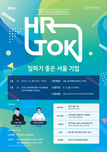 [813일 화] 3SBA 인사 네트워크 세미나=서울산업진흥원이 8월 13일 서울 대치동 SETEC SBA컨벤션센터 1층 컨벤션홀에서 중소기업·스타트업 세미나 ‘제3회 HR TOK’을 진행한다. HR TOK은 중소기업이나 스타트업 인사담당자간 최신 정보와 전문지식, 노하우 공유를 촉진하는 네트워크 행사. 지난 6월부터 매월 1회씩 정기적으로 개최되고 있다.