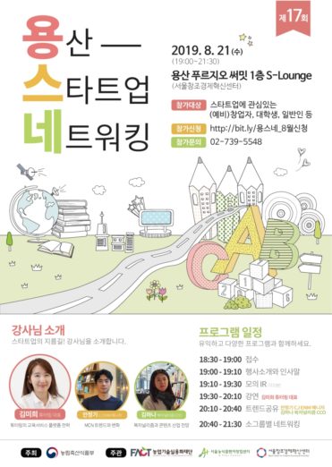 [821일 수] 용스네용산 스타트업 네트워킹=서울창조경제혁신센터가 농림축산식품부, 농업기술실용화재단, 서울A+센터와 함께 제 16회 용산 스타트업 네트워킹(용스네)를 8월 21일 용산 푸르지오 써밋 1층 서울창조경제혁신센터에서 개최한다. 용쓰네는 다양한 분야 스타트업과 관계자간 소통을 위한 네트워킹 행사로 스타트업 관련 이슈와 정보, 트렌드를 나눠 모의 IR, 강연, 트렌드 공유 기회를 마련하고 있다. 8월 용스네는 “튜터링의 교육서비스 플랫폼 전략”에 대해서 김미희 튜터링 대표 강연과 트렌드 공유로 ‘콘텐츠 핫플레이스 MCN 트렌드’를 CJ ENM 안정기 매니저와 ‘지적분야 콘텐츠 산업 방향’을 북저널리즘의 김하나 CCO와 함께 콘텐츠 트렌드에 대해 다룬다. 행사 이후에는 발표 연사와 함께 소규모 네트워킹 자리도 마련한다. 행사에 대한 자세한 내용은 이곳에서 확인할 수 있다.