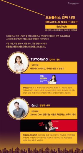 [822일 목] 드림플러스 스타트업 인사이트 나잇콘텐츠 편=한화생명 드림플러스가 월 1회 비즈니스 업계를 선도한 스타트업 대표의 이야기를 듣는 인사이트 토크쇼 ‘드림플러스 인사이트 나잇’을 8월 22일 서울 드림플러스 강남에서 개최한다. 이번 토크쇼는 4월 여행, 5월 핀테크, 6월 푸드, 7월 콘텐츠에 이어서 에듀테크를 주제로 다룬다. ‘에듀테크 스타트업, 튜터링의 생존과 성장기’를 주제로 24시간 1:1 영어회화앱 튜터링의 김미희 대표와 ‘Zero to One: 인공지능 기술로 혁신하는 교육의 미래’를 인공지능 튜터 산타토익의 뤼이드 장영준 대표가 연사로 나선다. 행사에 대한 자세한 내용은 이곳에서 확인할 수 있다.