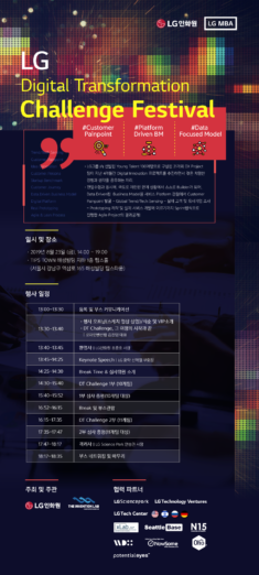 [823일 금] 2019 LG DT 챌린지 페스티벌=LG인화원이 주관하고 로아인벤션랩이 공동 주최하는 ‘LG DT Challenge Festival’이 8월 23일 역삼로 팁스타운S1에서 개최된다. 이번 행사는 LG그룹사의 핵심 인재 100명이 21개팀으로 DT(Digital Transformation, 디지털 트랜스포메이션)팀을 꾸리고 현업 업무를 수행하면서 동시에 애자일하게 디지털 비즈니스 경험을 3개월간 진행한 린(lean) 프로젝트다. 21개팀은 극도로 제한된 상황에서 스스로 빌더가 되어 데이터 기반 모델을 서비스 플랫폼 관점에서 고객의 페인 포인트(Pain point)를 발굴, 글로벌 트렌드와 기술 파악, 실제 고객과 유사 기업 조사해 프로토타입 제작과 실제 서비스 개발에 이르기까지 스프린트 방식으로 프로젝트를 진행했다. 그 여정의 결과물을 이번 행사에서 업계 관계자에게 공유할 예정. 행사에 대한 자세한 내용은 이곳에서 확인할 수 있다.