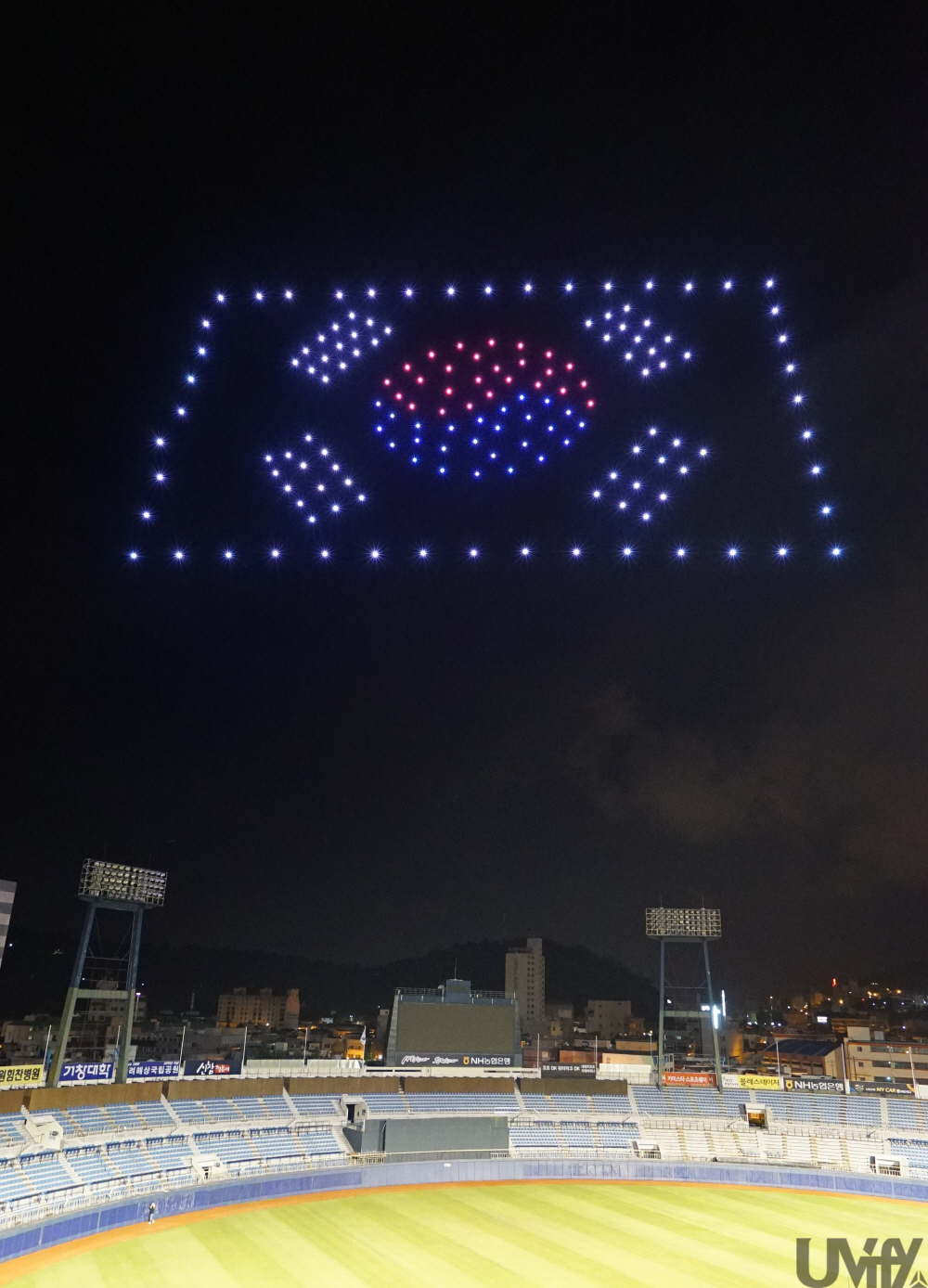 드론 150대를 이용해 가로 81m, 세로 54m 대형 드론 태극기를 선보인 것. 지난 2002년 월드컵 당시 붉은 악마가 제작한 가로 60m, 세로 40m짜리 대형 태극기나 포항시가 2005년 제작한 가로세로 80×53m보다 더 큰 것이다.