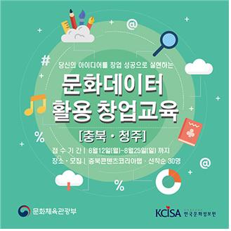 한국문화정보원이 8월 27∼29일, 9월 3∼4일까지 5일간 충북콘텐츠코리아랩에서 문화데이터 창업교육을 진행한다고 밝혔다.
