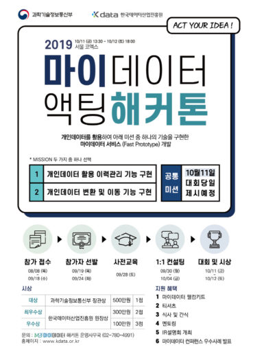 과학기술정보통신부와 한국데이터산업진흥원이 제1회 마이데이터 액팅 해커톤 대회 참가팀을 9월 18일까지 모집한다.