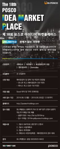 포스코 아이디어 마켓플레이스는 우수 예비창업자와 초기 스타트업을 발굴, 투자와 팁스 프로그램에 연계해 창업과 성공을 돕고자 포스코측이 지원하는 프로그램. 지원 대상은 전 산업분야 예비창업자와 업력 7년 미만 창업팀이며 예비창업자부터 3년 미만 창업팀은 유니콘 리그, 3년~7년 미만 팀은 피닉스 리그로 구분 모집한다.