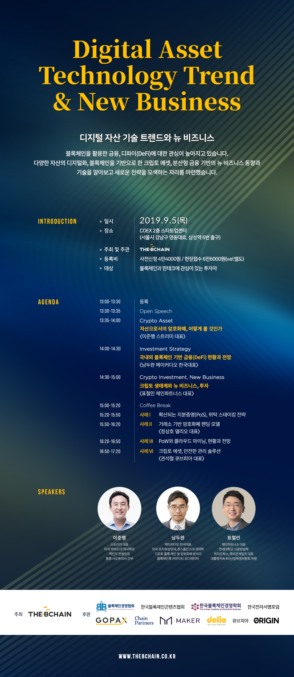 이번 행사에선 블록체인 업계 리더가 직접 블록체인 기반 디지털 자산 의미와 효과적인 디지털 자산 활용 전략, 국내외 동향을 공유한다. 이준행 고팍스 대표가 ‘자산으로서의 암호화폐 어떻게 볼 것인가?’를 주제로 강연에 나서며 남두완 메이커다오 한국대표가 국내외 블록체인 기반 금융서비스 현황을 정리하고 향후 전망을 발표한다. 또 표철민 체인파트너스 대표가 ‘크립토 생태계와 뉴 비즈니스, 투자’를 주제로 암호화폐 기반 금융 서비스와 향후 전망에 대한 비전을 공개할 예정.