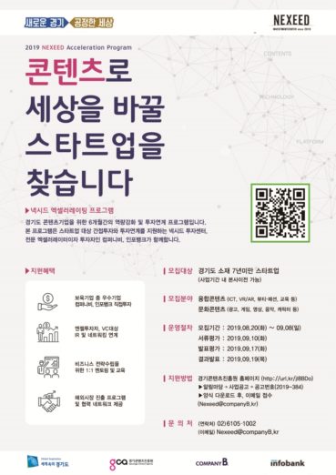경기콘텐츠진흥원이 9월 8일까지 넥시드 액셀러레이팅 프로그램 참가 기업을 모집한다고 밝혔다.
