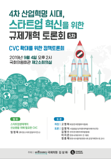 발제는 임정욱 스타트업얼라이언스 센터장이 맡아 국내 CVC 현황을 비교 분석하고 스타트업 선순환을 위한 CVC 확대 필요성에 대해 논한다. 토론은 고영하 한국엔젤투자협회장이 좌장을 맡고 김영덕 롯데액셀러레이터 상무, 김형수 한국벤처캐피탈협회 전무, 이지은 변호사, 정종채 서울지방변호사회 공정거래연수원 교수 등이 참여한다. 또 김주식 중소벤처기업부 벤처투자과장, 박기흥 공정거래위원회 지주회사과장이 배석한다.