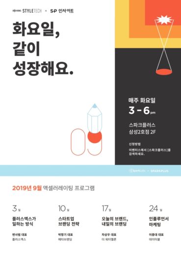 ◇[9월 3일 수요일] [스타일테크 X SP인사이트] 9월 액셀러레이팅 프로그램=스파크랩과 스파크플러스의 액셀러레이팅 프로그램 ‘스타일테크 X SP인사이트’ 9월 프로그램이 오는 3일부터 매주 화요일 오후 3시~6시 스파크플러스 삼성2호점에서 개최된다. 이번 9월 프로그램은 주별로 △변사범 플러스엑스 대표 ‘플러스엑스가 일하는 방식’ △박항기 메타브랜딩 대표 ‘스타트업, 브랜딩 전략’ △차상우 더워터멜론 대표 ‘오늘의 브랜드, 내일의 브랜딩’ △이종대 데이터블 대표 ‘인플루언서 마케팅’에 대하여 이야기로 구성된다. 프로그램은 무료로 누구나 방문할 수 있으며 이곳에서 신청하면 된다.