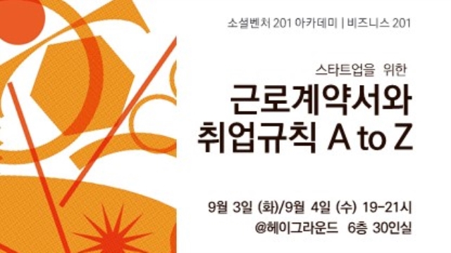 ◇[9월 3일 화요일] 루트임팩트 소셜벤처 201 아카데미=사단법인 루트임팩트는 8월부터 12월까지 소셜벤처사가 현업에 바로 적용할 수 있는 내용으로 구성된 실무교육 프로그램 ‘소셜벤처 201’ 아카데미를 운영한다. 소셜벤처 201 아카데미는 △재무, 회계, 채용 등 조직 기틀을 다지기 위한 경영관리 실습 ‘비즈니스 201’ △중간관리자를 위한 기획, 리더십, 데이터 분석 관리법 전수 ‘매니저십 201’ △일하기 좋은 기업 문화 사례를 살피는 ‘조직문화 201’로 구성된다.
