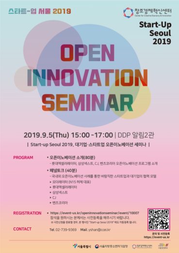 ◇[9월 5일 목요일] Start-up Seoul 2019: 오픈이노베이션 세미나=서울특별시가 주최하고 서울산업진흥원이 주관하는 ‘스타트업 서울(Start-Up Seoul: Tech-Rise 2019)’이 오는 4일부터 6일까지 3일간 동대문 디자인 플라자를 중심으로 서울바이오허브, 서울창업허브, 양재 R&D 혁신허브에서 동시 개최된다. 서울을 대표하는 스타트업 행사인 스타트업 서울은 △글로벌 △콘테스트 △나눔, 크게 3가지 테마로 구성돼 20개국 200개 스타트업과 300여 개 국내외 스타트업 생태계 플레이어가 참여할 예정이다.