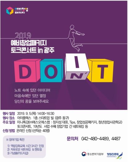 ◇[9월 5일 목요일] 예비창업패키지 토크콘서트 in 광주=중소벤처기업부와 창업진흥원이 광주·전라 지역 창업 활성화를 위해 예비 창업 패키지 토크콘서트를 오는 5일 오후 2시부터 광주 동구 IPLEX 1층 스타트업빌에서 개최한다. 행사 프로그램에는 자동차 기술지원 스타트업 에스오에스랩(SOS LAB)의 정지성 대표의 미니특강, 정부와 투자자, 선배 창업기업과 궁금증을 해소하는 토크콘서트, 분야별 전문가와의 네트워킹 시간이 포함된다. 이번 행사 참가자는 예비창업패키지 역량강화교육 3시간 시수 인정과 함께 기념품도 받을 수 있다. 행사에 대한 자세한 내용 확인과 참가신청은 이곳에서 할 수 있다.