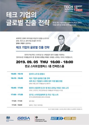 ◇[9월 5일 목요일] 테크 기업의 글로벌 진출 전략=주한 영국 대사관과 경제과학진흥원이 오는 5일 오후 4시 판교 스타트업 캠퍼스 1층 컨퍼런스 홀에서 테크 기업 글로벌 진출 전략 세미나를 개최한다. 이를 통해 영국 정부 주관 국제적인 스타트업 경영대회인 UK Tech Rocketship Awards 프로그램, 주요 혁신산업 육성정책, 기술기반 기업 글로벌 성장기회를 논의할 예정이다.