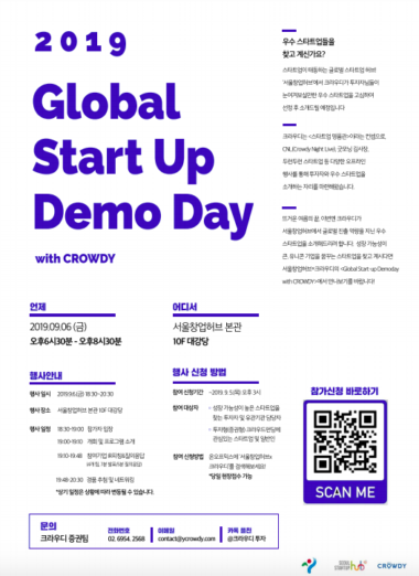 크라우드펀딩 플랫폼 크라우디가 오는 6일 서울창업허브 본관에서 ‘2019 글로벌 스타트업 데모데이 with CROWDY’를 연다고 밝혔다.