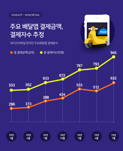 와이즈앱이 배달의 민족, 요기요, 배달통 등 주요 배달앱에서 신용카드, 체크카드 등으로 결제한 금액을 표본 조사한 결과 3개 배달앱 월 결제금액은 2018년 1월 2,960억 원에서 올 7월 6,320억 원을 넘어섰다. 1년 6개월 만에 114% 증가세를 보인 것으로 추정된다.