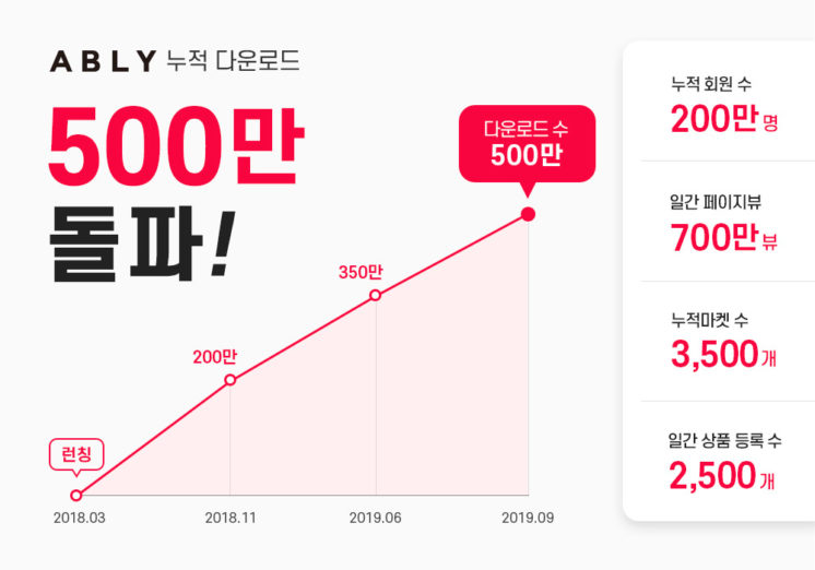 에이블리가 앱 누적 다운로드 500만 건을 돌파했다고 밝혔다. 지난해 3월 서비스 출시 이후 1년 6개월 만에 이룬 성과. 현재 누적 회원 수는 200만 명이며 일간 페이지뷰는 700만 건, 입점 마켓 수는 3,500대다. 매일 상품 2,500여 개가 등록된다.