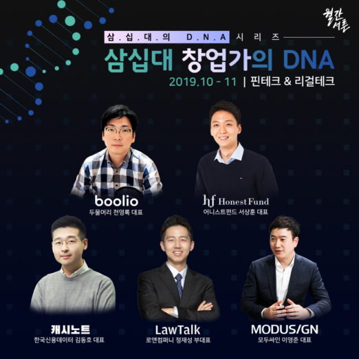 강연을 이끌 이는 ▲로보어드바이저 ‘불리오’를 운영하는 천영록 두물머리 대표 ▲P2P플랫폼 ‘어니스트펀드’의 서상훈 대표 ▲’캐시노트’를 운영하는 김동호 한국신용데이터 대표 ▲간편 전자계약 서비스 ‘모두싸인’을 선보인 이영준 대표 ▲법률서비스 ‘로톡’을 운영하는 정재성 로앤 컴퍼니 부대표다.