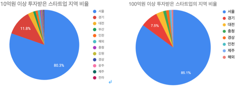 스타트업얼라이언스가 2015년부터 공개 중인 스타트업맵에 등록된 10억원 이상 투자 받은 스타트업은 575개, 100억원 이상 투자 받은 곳은 161개다. 이 중 90% 이상은 수도권, 그 중에서도 80% 이상은 서울이며 절반 정도는 강남구 서초구, 3분의 1은 테헤란로 인근에 위치하고 있다.